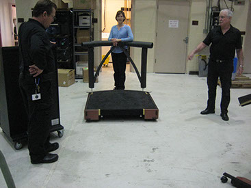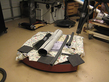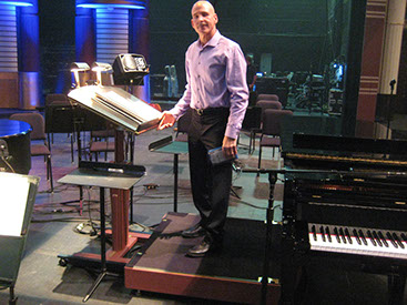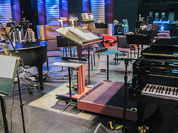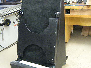 Here is a sample of what we can do. We used an art deco look to match the center's architecture and design. Even the colors were selected to match. Materials included steel, aluminum, carpet, high-density plastic and of course wood! The rail can be used in place or taken out when necessary. All removable parts have locks to keep them secure and in place. The height of the music stand can be adjusted very easily because of our easy-lift system. This conductor's suite comes with dolly and padding to keep it protected.